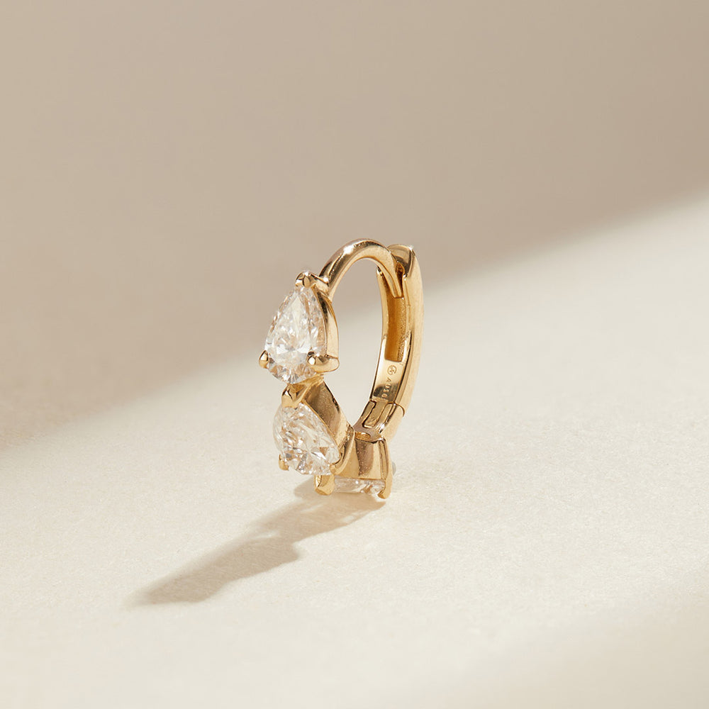 This exquisite gold huggie earring boasts three dazzling pear shaped lab grown diamonds, blending ethical charm with timeless elegance. Crafted to perfection, it’s ideal for adding a touch of luxury to any look, be it daily wear or special occasions.